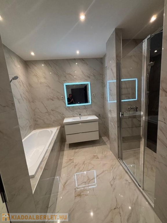A fürdőszoba ( zuhanyzós és fürdökádas), ahol külön beépített szekrényben "Mille" mosó és szárítógép található! A nyílászárók távirányítós, motoros működtetésű, alumínium redőnnyel felszereltek és szúnyoghálóval ellátottak.