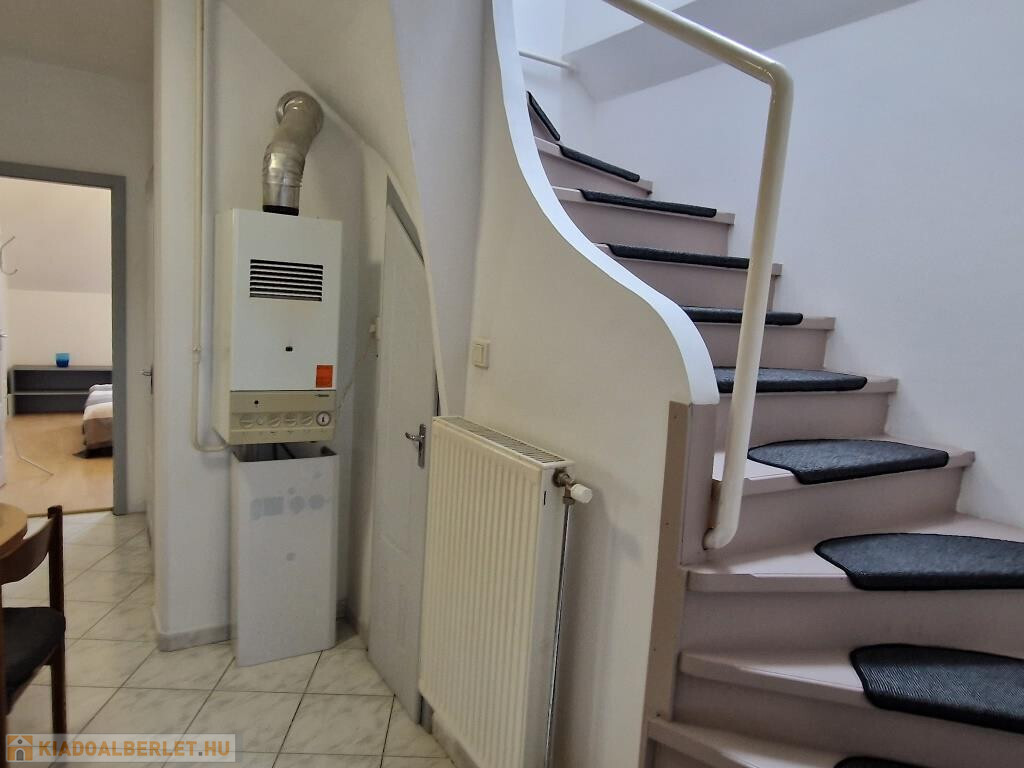 Kaposvár belvárosában, a Teleki utcában kínáljuk bérbevételre ezt a belső kétszintes, 1 + 3 félszobás lakást. Alapterülete 87 m2, a társasház harmadik emeletén helyezkedik el. Alsó szintjén a tágas előtér étkezőként is szolgál, innen nyílik a konyha, a nagyobb méretű nappali szoba, az egyik félszoba, egy zuhanyzós fürdő, valamint egy kis kamra. Innen vezet fel a lépcső a felső szintre, ahol találunk még egy fürdőt sarokkáddal, és két kisebb hálószobát. A lakás tágas, világos, barátságos, elrendezése praktikus. Fűtése saját gázkazánnal megoldott, és légkondi berendezés is van. A lakás a képeken látható bútorzattal és háztartási gépekkel együtt kiadó. Van lehetőség garázst is bérelni, ennek ára plusz 25 EFt havonta. Nemdohányzó bérlőt keresünk hosszabb távra, legalább egy évre, aki a kéthavi bérleti díjnak megfelelő összegű kaució és az első havi bérleti díj kifizetése után beköltözhet. Dohányzás és állattartás tilos.