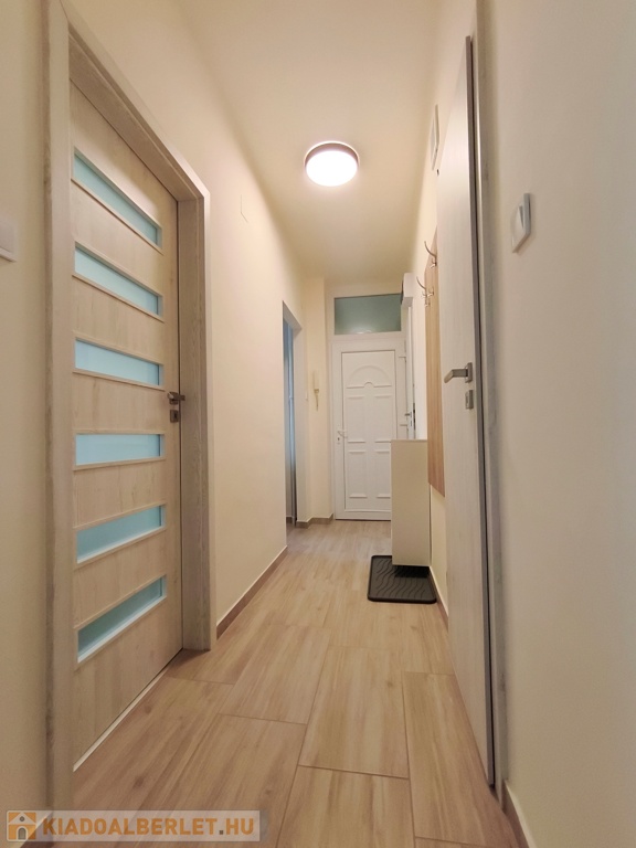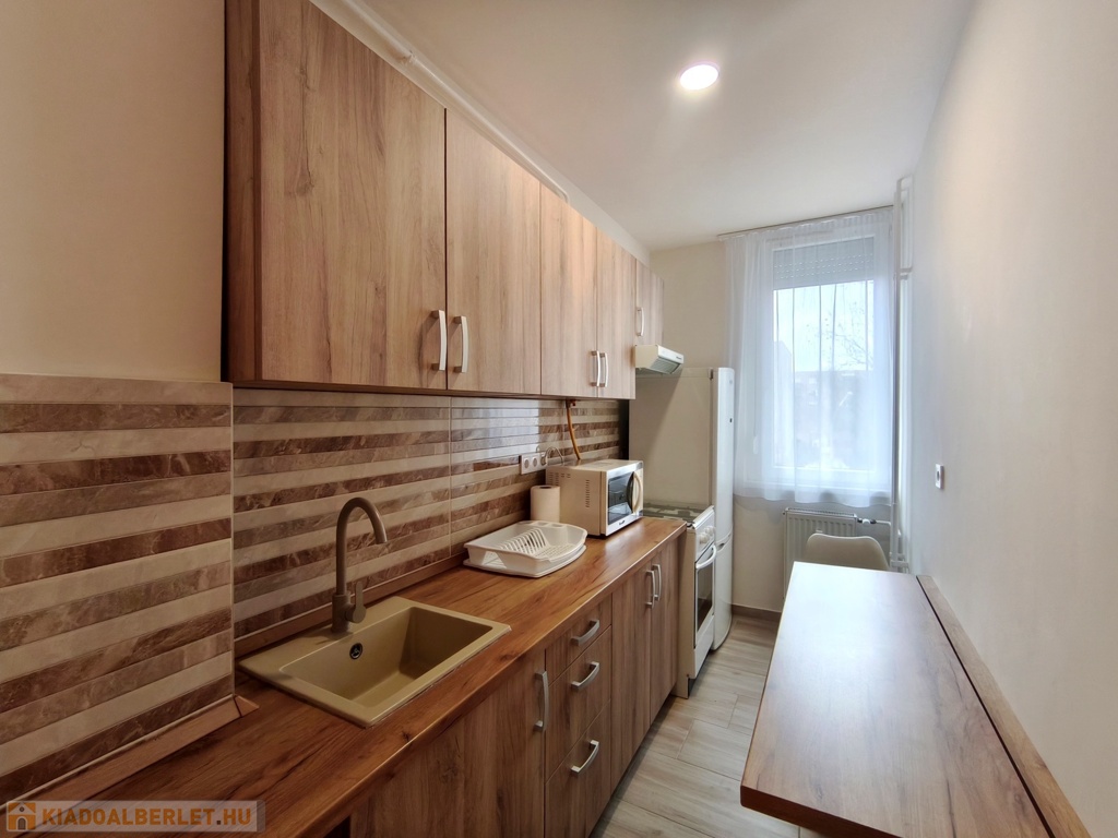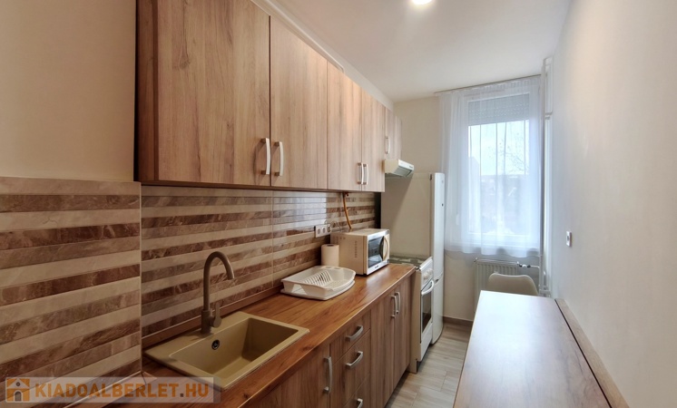 Nyíregyháza Belvárosában, az Északi körúton kiadó egy teljes körűen felújított, 43 m²-es, 1+1 szobás, műanyag nyílászárókkal és redőnnyel szerelt, járólap és laminált burkolattal rendelkező bútorozott, gépesített  lakás téglaépítésű társasházban.