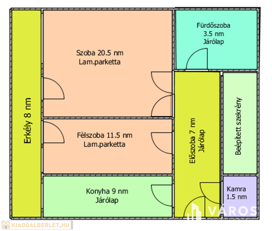 A lakásban 2 külön nyíló szoba, konyha, kamra, előszoba, fürdőszoba, erkély (8 nm) található.