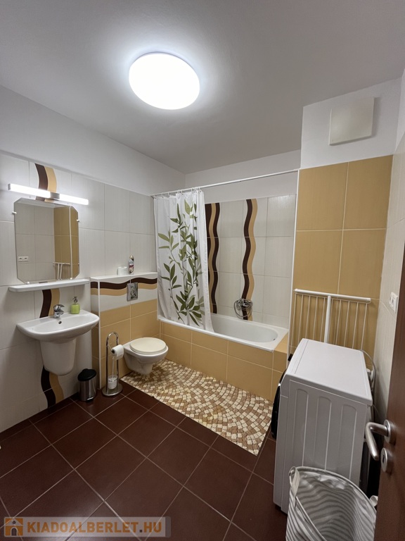 A lakásba lépve egy előszobába jutunk, melyből balra nyílik a káddal és mosógéppel ellátott fürdőszoba.