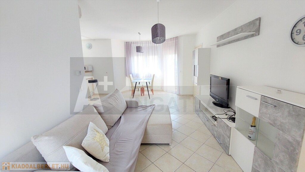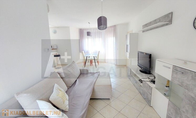 A lakás berendezett és gépesített (hűtő, mikró, mosógép).