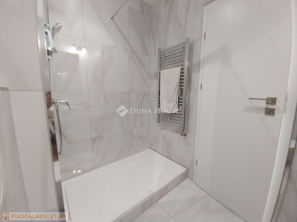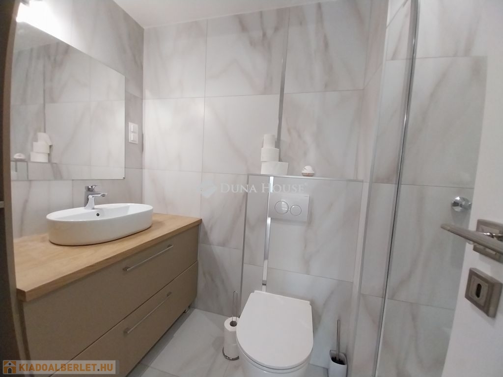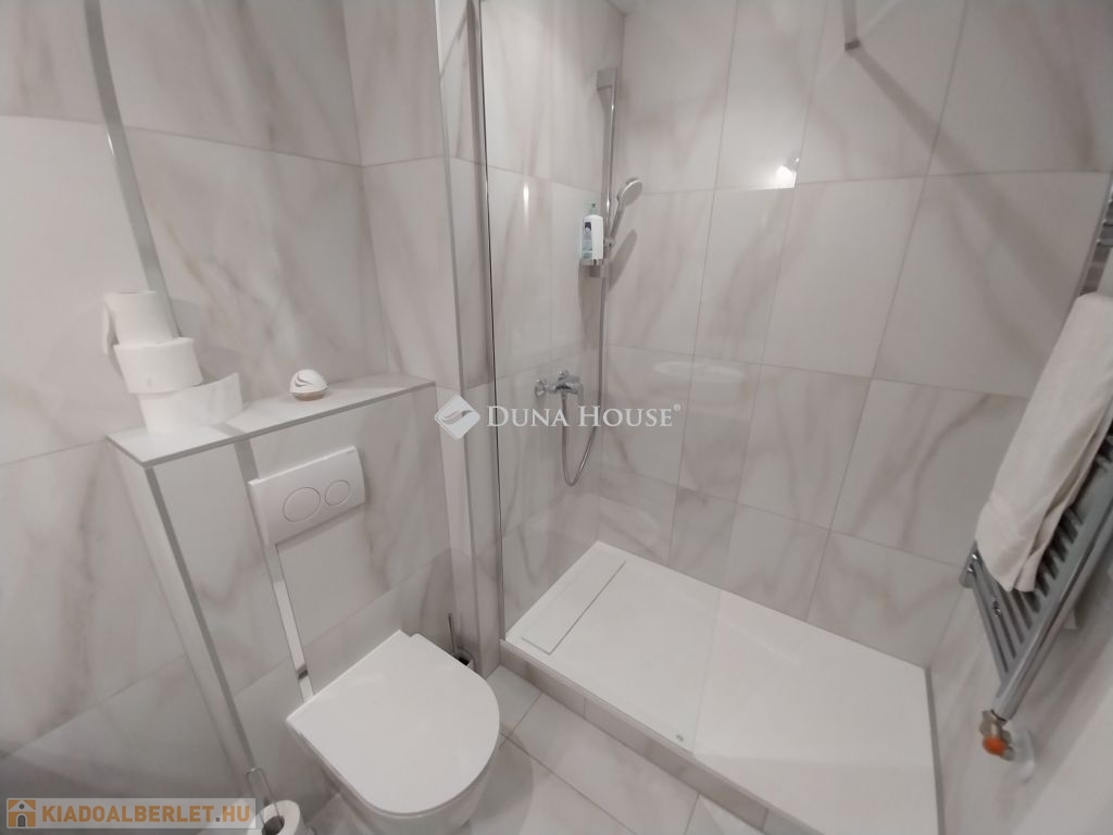 A fürdőszobába zuhanykabin került beépítésre, a mellékhelyiség nem szeparált.