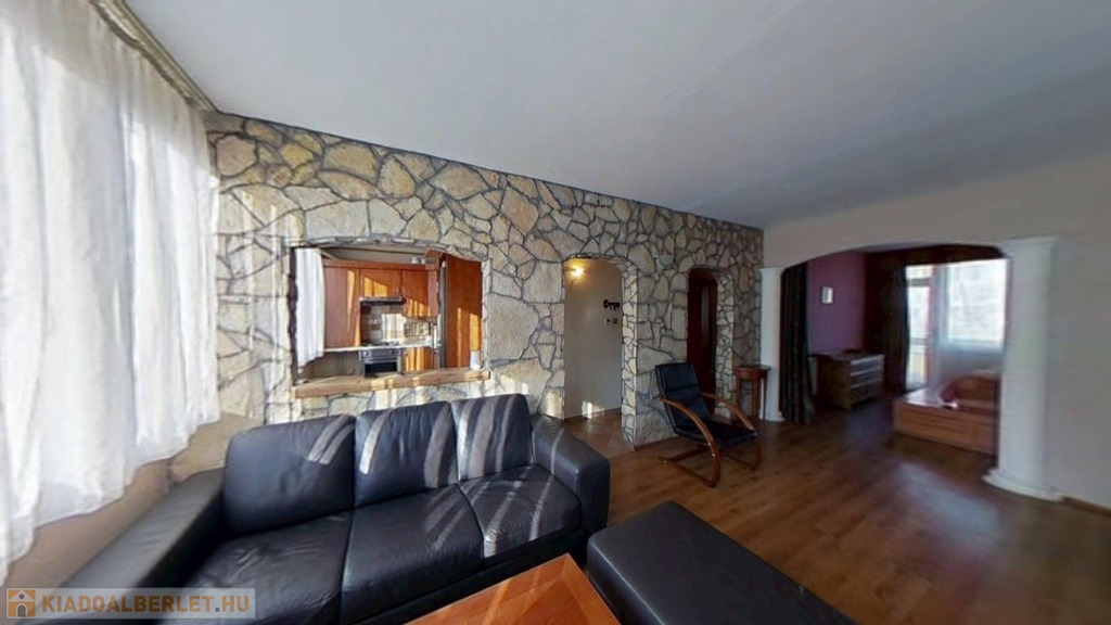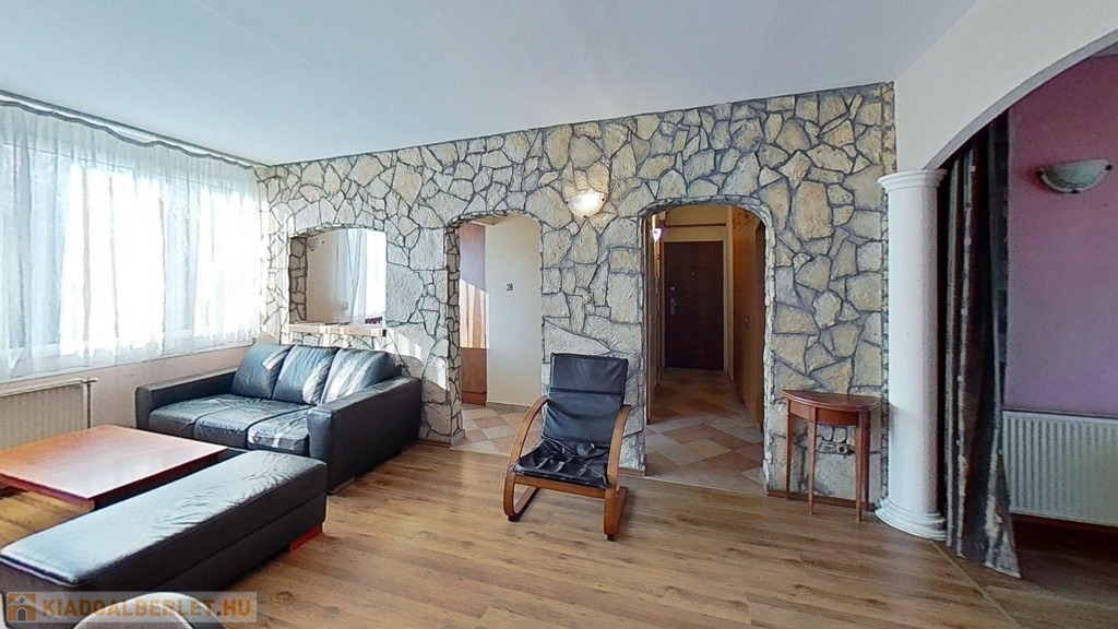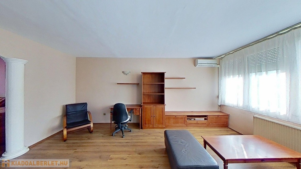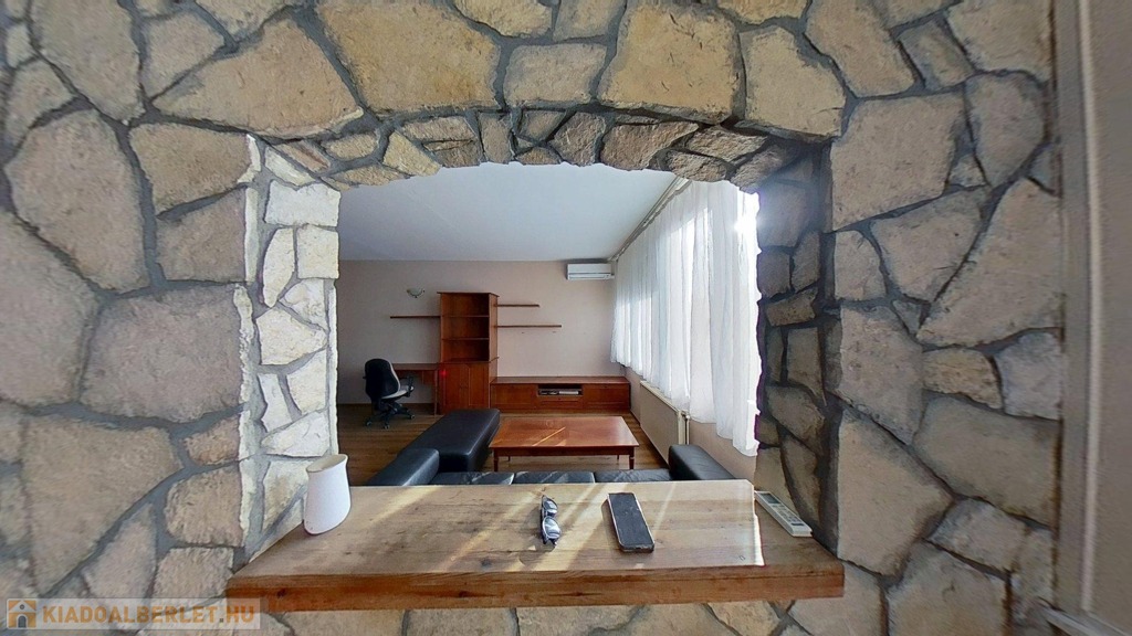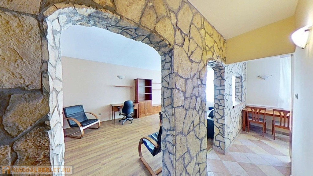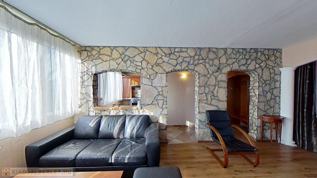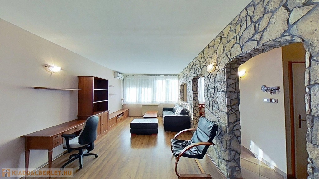 A klimatizált lakás egyedi megjelenését a hálószobában az oszlopok, a dobogós ágy, és a tereket részben leválasztó rusztikus hatású kőfal adja. Lényegében a fürdő és az illemhelyiség kivételével nincsenek elválasztó ajtók, így a nappali, előtér, konyha és hálószoba egy légtér. Az előtérben egyedi tervezésű mindent elnyelő beépített szekrény kapott helyet. A lakás gépesített, bútorozottan kerül bérbeadásra.