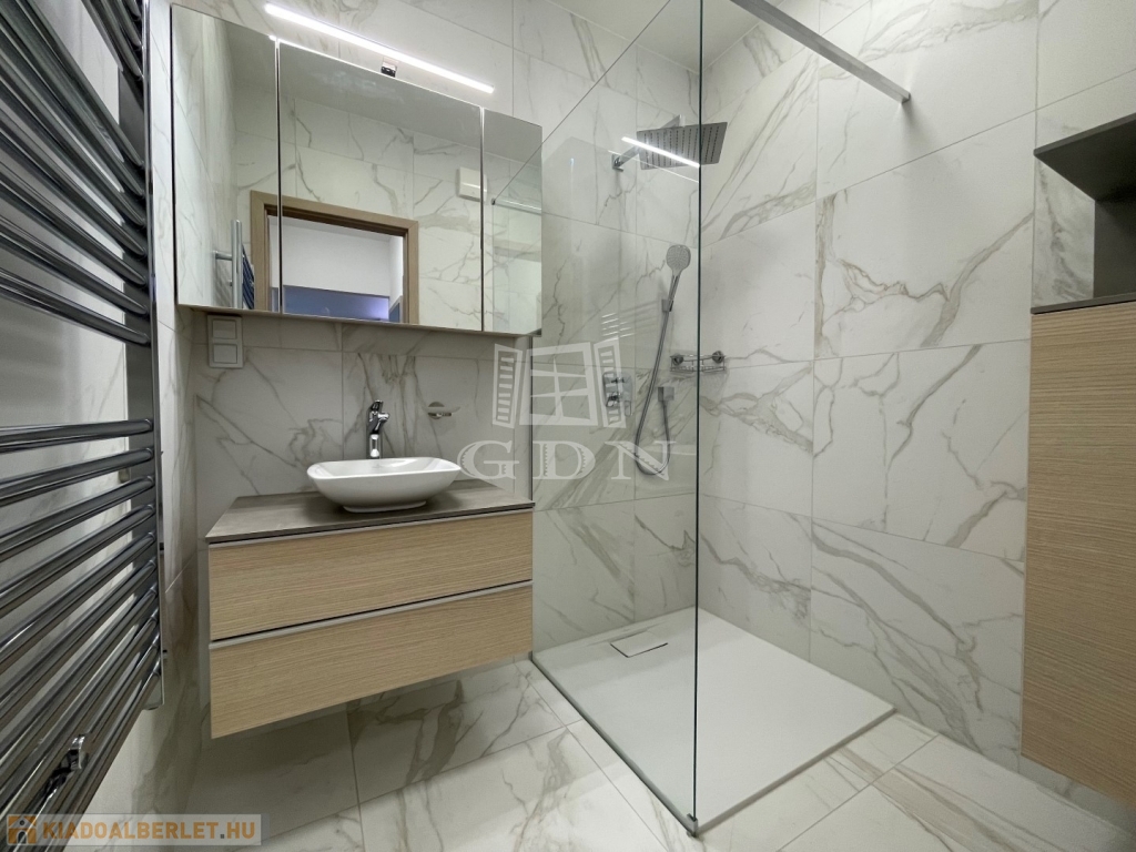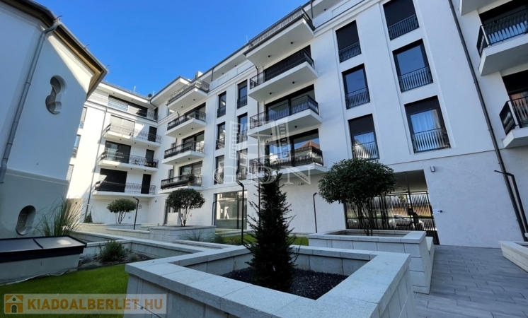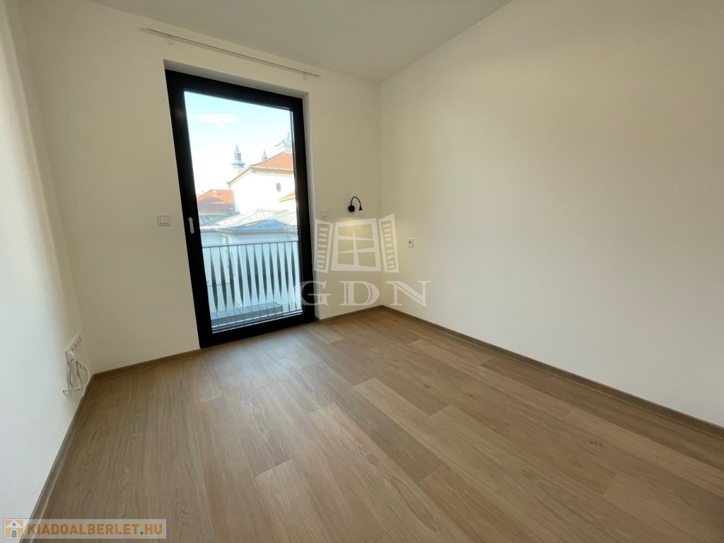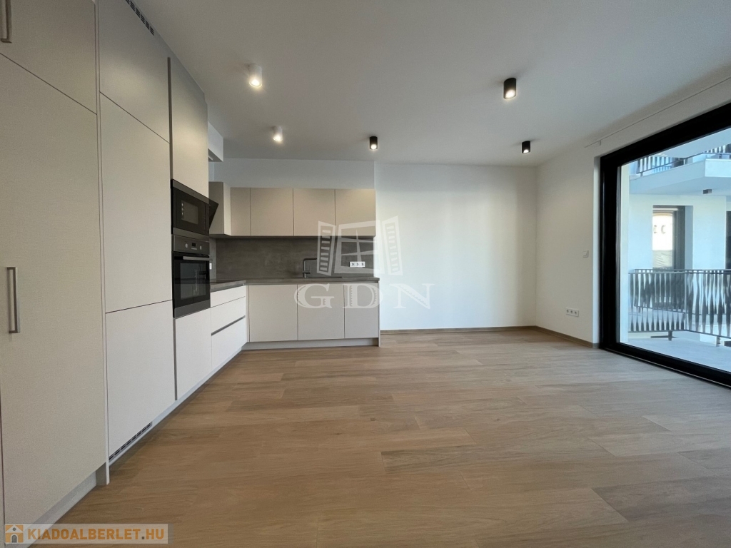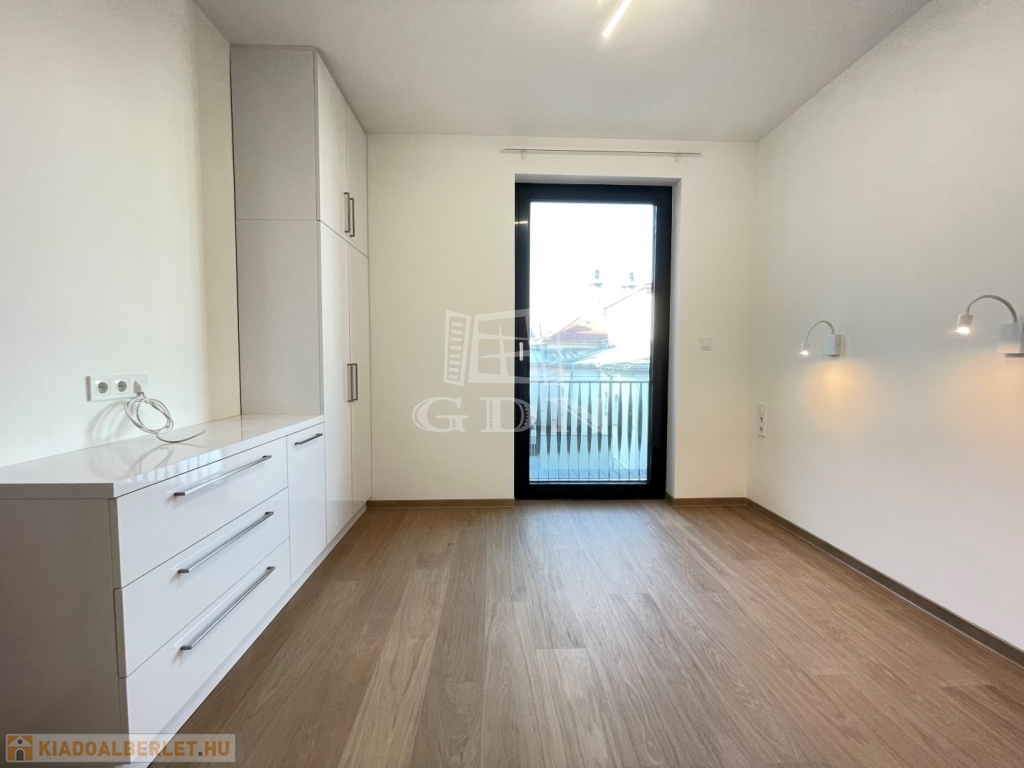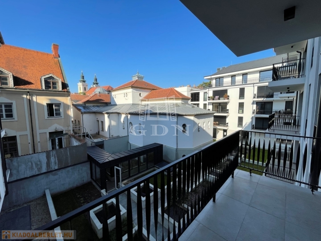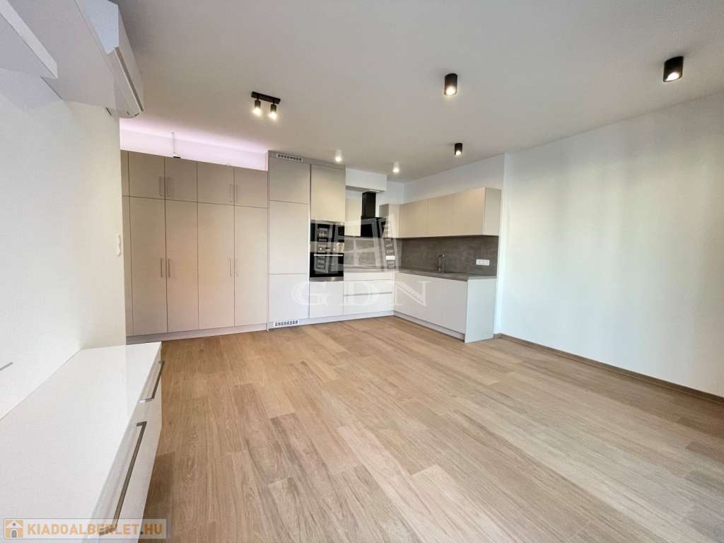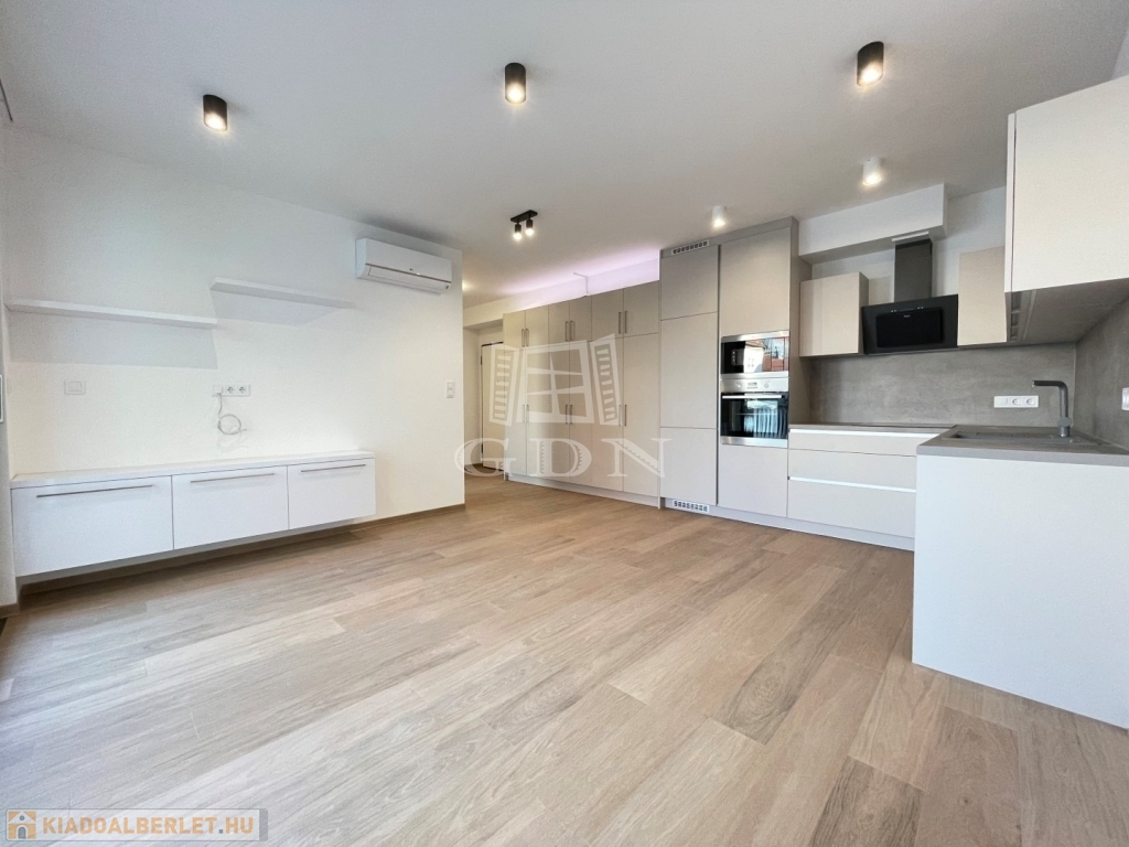 BL-003375. Belvárosban, modern akadálymentes, 2 lifttel ellátott társasházban 50 nm nagyságú, 6 nm-es erkéllyel rendelkező, amerikai konyhás nappali + 2 fél szoba elosztású lakás gépesítve, részben vagy egészben bútorozva (igény szerint), (jelenleg a képeken látható berendezési tárgyak találhatók meg), SMART HOME rendszerrel szerelve, valamint az épület alatt található teremgarázsban 1 autó számára biztosított beálló hellyel együtt hosszútávra kiadó.