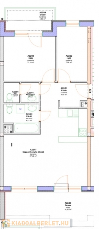 Az ingatlan gépesített konyhával (hűtőszekrény, mosógatógép, indukciós főzőlap, villanytűzhely, páraelszívó), két hálószobával + nappalival + 2 db nagy terasszal rendelkezik, összesen 70 m2.