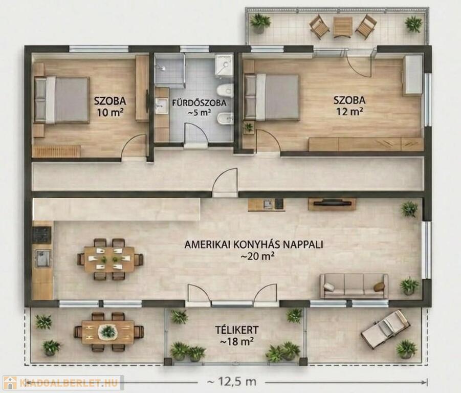 A lakás elosztása: amerikai konyhás nappali, 2 külön nyíló hálószoba, valamint egy 18 m²-es fedett, világos télikert, amely egész évben jól használható, plusz életteret biztosít.