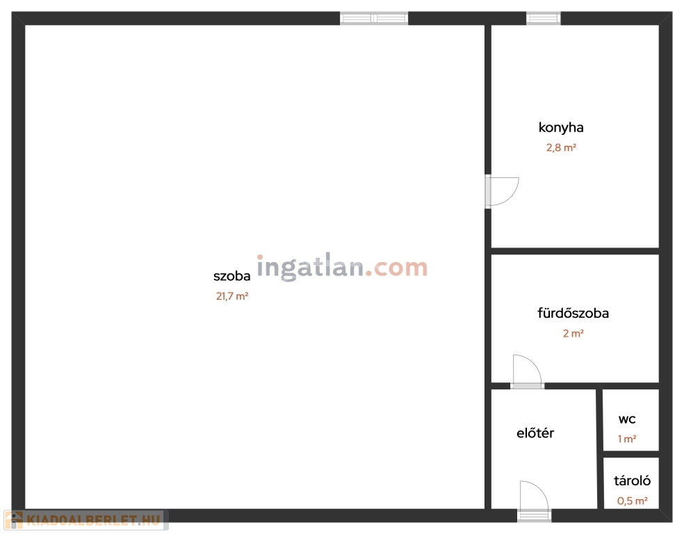 szoba 18,00m2, fürdőszoba 2,00m2, konyha-étkező-nappali 4,00m2, közlekedő-előtér 3,00m2, wc 1,00m2;