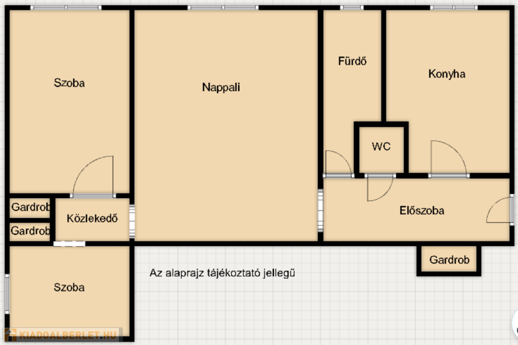 • 58 nm-es, praktikus elosztás: 1 nappali + 2 külön szoba