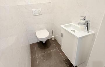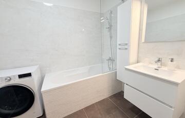 A burkolatok, szaniterek igényes, modern arculatot adnak a kis lakásnak.