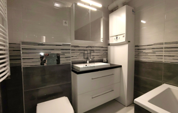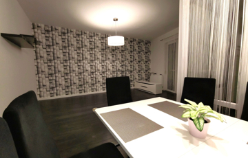 -Modern, gépesített konyha: beépített sütő, főzőlap, páraelszívó, mosogatógép, mikró, hűtő-fagyasztó