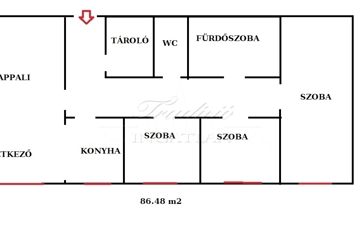 A jó elosztású lakás áll egy nagyméretű amerikai konyhás nappaliból, 2 kisebb, 1 nagyobb hálószobából, kamrából, előszobából, fürdőszobából, és egy vendégmosdóból.