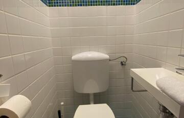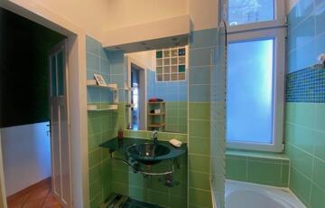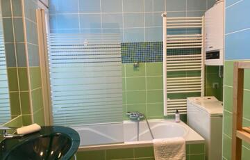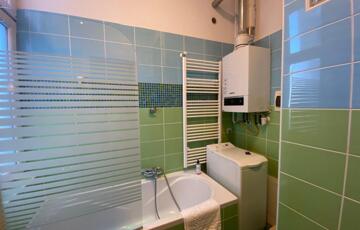 A fürdőszoba kádas és ablakos, a WC külön helyiségben található, kézmosóval.