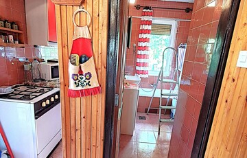 1,5 szobás, konyha, fürdő, wc, gázkonvektor fűtés, 25 m2-es terasz.