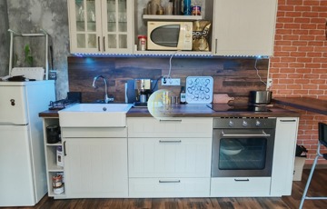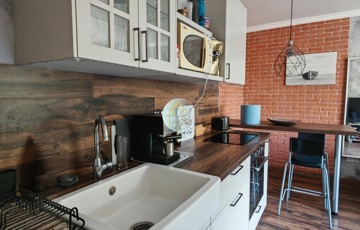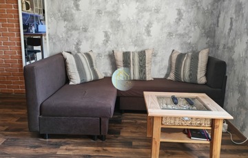 Beépített konyhabútor gépekkel felszerelt, nappaliban tévé, kanapé, a fürdőben mosógép, mosdószekrény.
