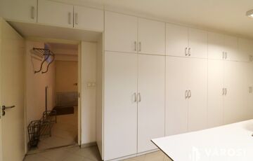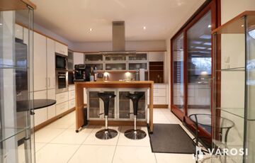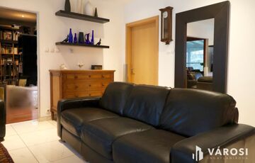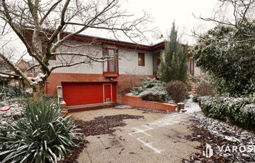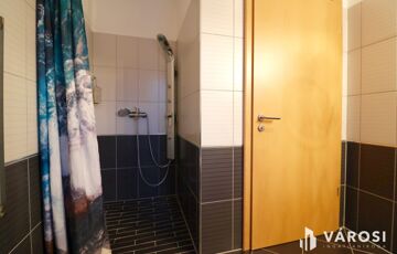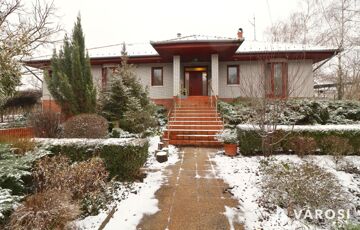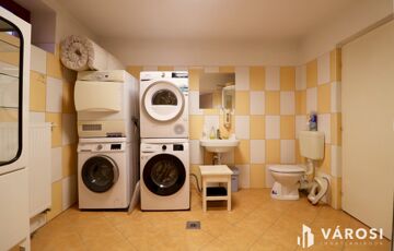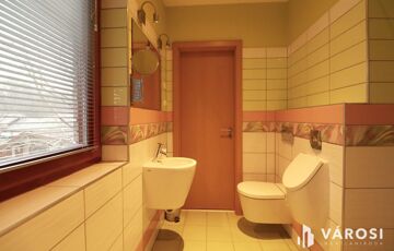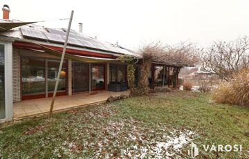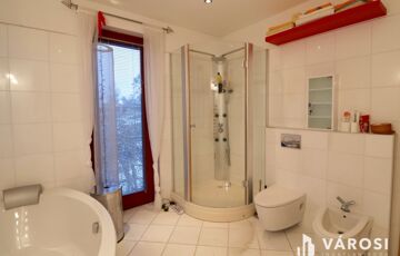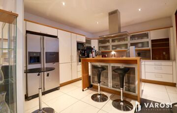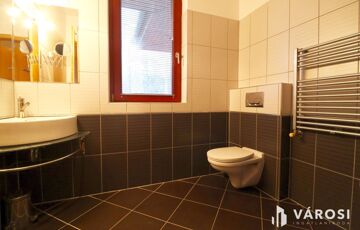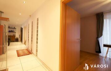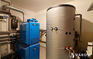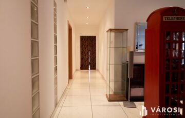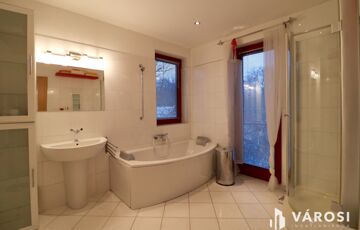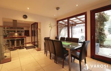 Tágas Nappali és Étkező helyiségben helyett kapott egy látvány-kandalló, innen nyílik a beépített teljesen felszerelt Konyha és a Dolgozó-szoba. Ezen a szinten lévő három hálószobához saját fürdőszoba tartozik. A Téli-kert a Dolgozó-szobából és a teraszról is megközelíthető. Az ~58,00 m2 fedett, burkolt terasz - kültéri sütögetővel - növeli a lakótér kihasználhatóságát. A kétállásos garázs ~ 44,00 m2. Központi fűtést egy Buderus Logano G 124 kazán -csökkentett káros-anyag kibocsátású, teljesen automatikus üzemű -biztosítja.