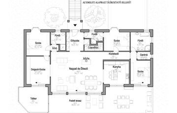 - Emelet: ~170,30 m2 + ~18,00 Télikert + ~58,50 m2 Fedett terasz