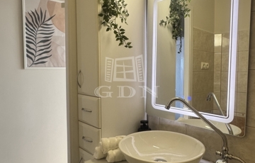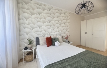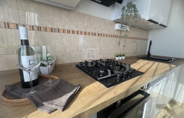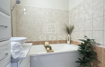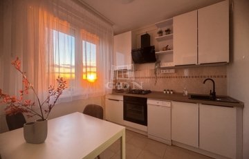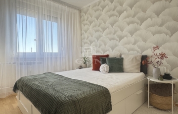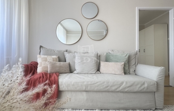 A napsütötte nappaliban ágyazható, kényelmes kanapé, nagyméretű TV szekrény kapott helyet, és kialakításra került egy kényelmes dolgozósarok is, így a home office sem lehet akadály a leendő bérlő számára. A hálószoba tágas, nagyméretű franciaággyal, minőségi ágymatraccal, gardróbszekrénnyel felszerelt. A modern, új konyha teljesen új beépített gépekkel (gáz főzőlap, hőlégkeveréses sütő, páraelszívó, mosogatógép), a konyhapult LED világítással felszerelt. Az étkezőasztal körbeülhető, és igény szerint kinyitható. Igazi kuriózum, hogy a konyhából esténként csodás naplementében gyönyörködhetünk. A kádas, hangulatos fürdőszobában LED-es tükör, fiókos mosdószekrény és mosógépkiállás biztosítják a kényelmet a mindennapokban. A WC külön helyiségben került elhelyezésre. A háztartási helyiség nagy tárolókapacitásával tovább fokozza a lakás praktikusságát. A lakás bejárata előtt egy 3 nm, saját használatú, zárható előtér tovább növeli a lakás komfort- és biztonságérzetét.
