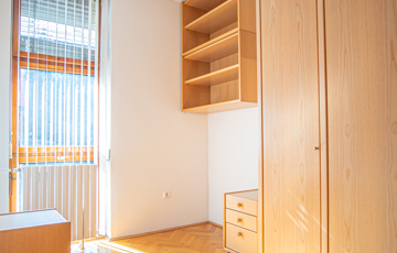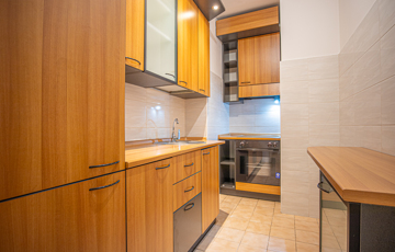 A lakás részben bútorozott és gépesített: több beépített szekrény, asztal, székek, hűtő.