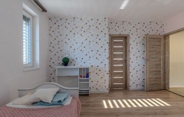 Az emeleti privát élettérben három hálószoba, gardrób, háztartási helyiség és egy kényelmes méretű fürdőszoba található. A kertre néző szobák nagyméretű teraszai tovább erősítik a szabadság és a nyugalom érzetét.